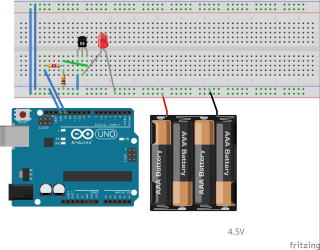 ブレッドボードでの実体配線図です。電池はアルカリ電池だと3本 4.5Vで駆動させています。